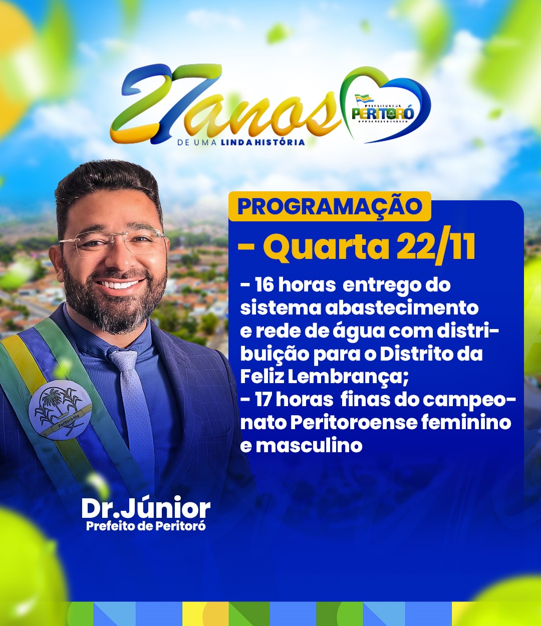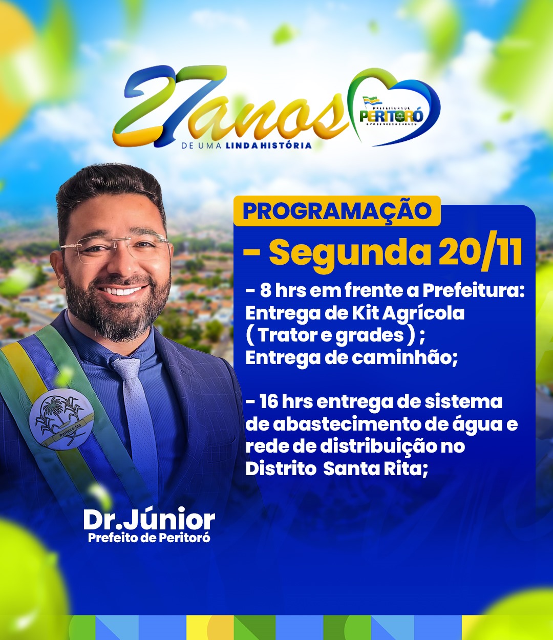 Alô, Peritoró! Prepare-se para a grande festa em comemoração aos 27 anos de emancipação política da nossa cidade no dia 21 de novembro. Sob a liderança do prefeito Dr. Junior, a Prefeitura de Peritoró preparou uma programação especial para marcar esse momento único.