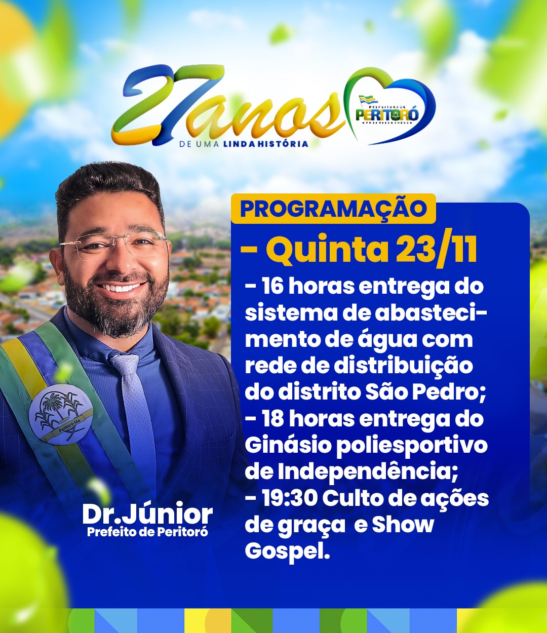 Venha celebrar conosco esses 27 anos de história, progresso e fé em Peritoró. Afinal, “Tudo posso naquele que me fortalece.” – Prefeitura de Peritoró: O progresso chegou!